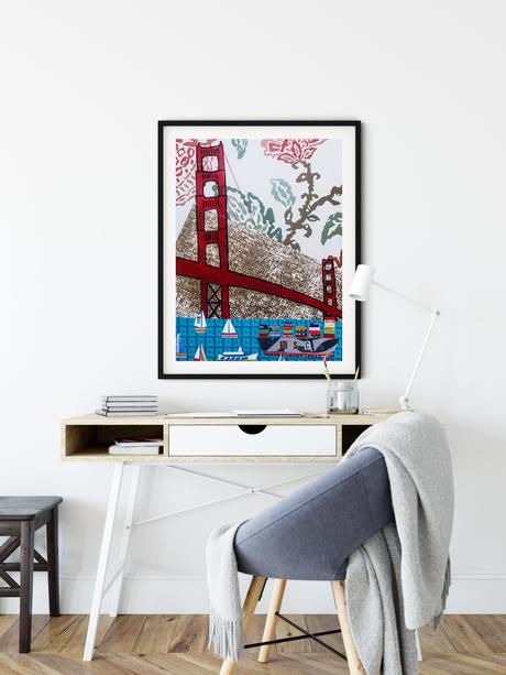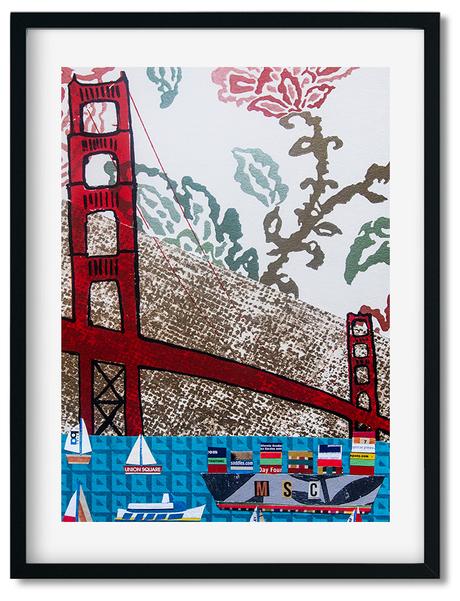 The SF Skyline meets the Golden Gate with this fun print of a collage made from wallpaper, ticket stubs, and photo of Embarcadero tile.